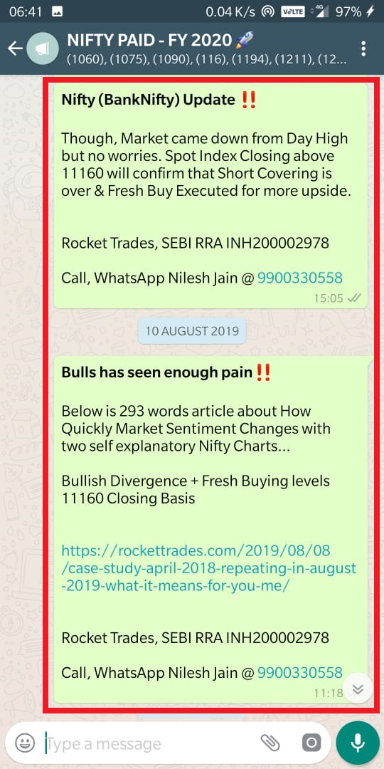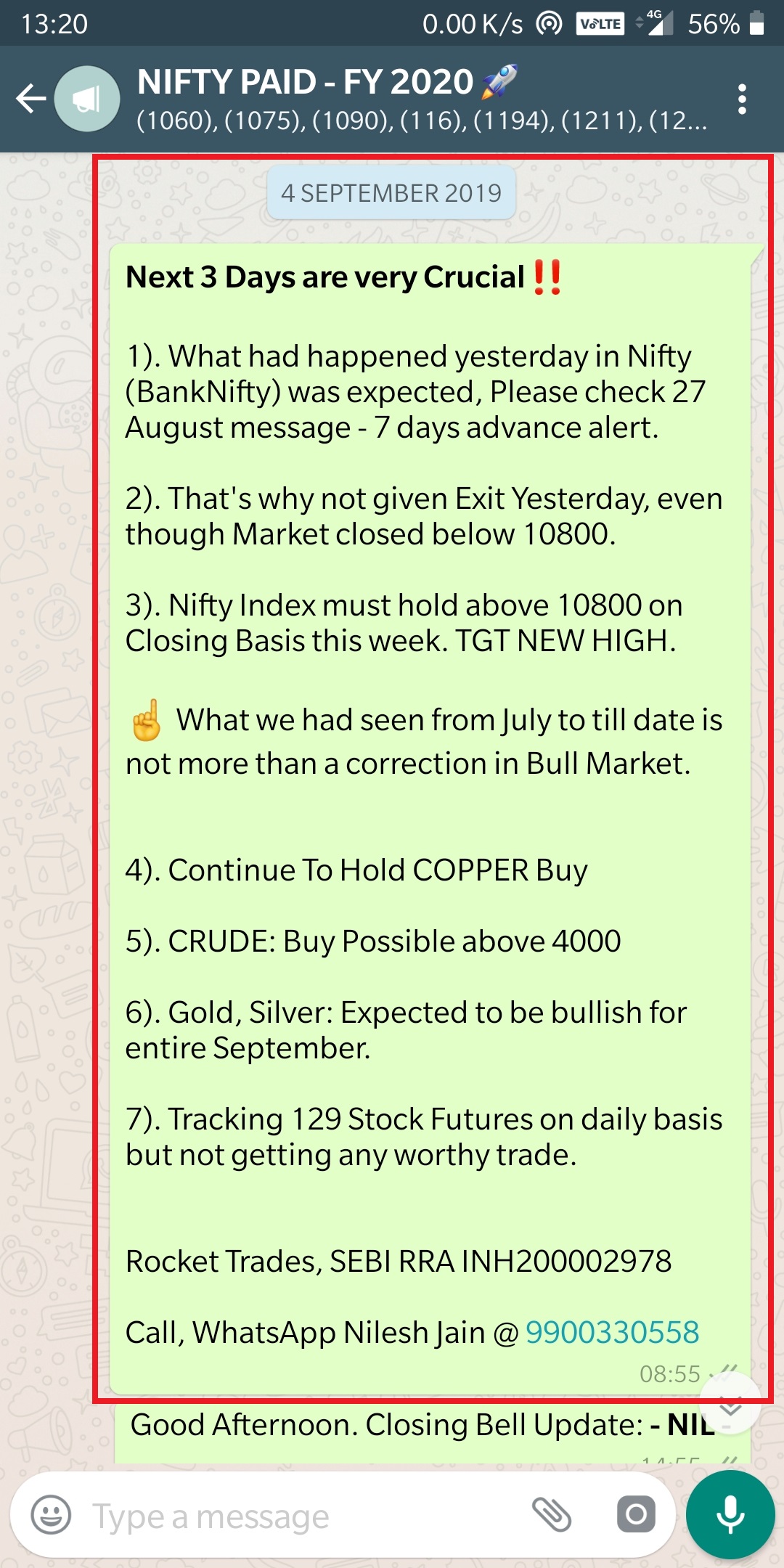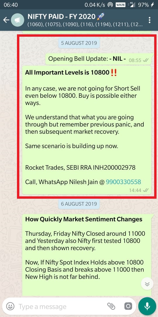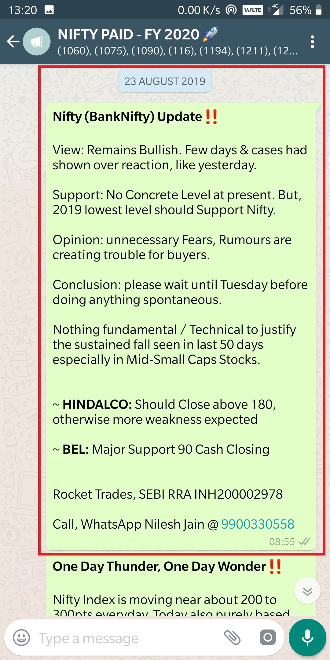 Nifty started falling from 4th July 2019 High and Stopped exactly the day when we mentioned 10800 Support to our Clients. Even Free Trial Clients were also updated at the same time. And, thereafter 11160 was also Updated to Clients on Friday 9th August.