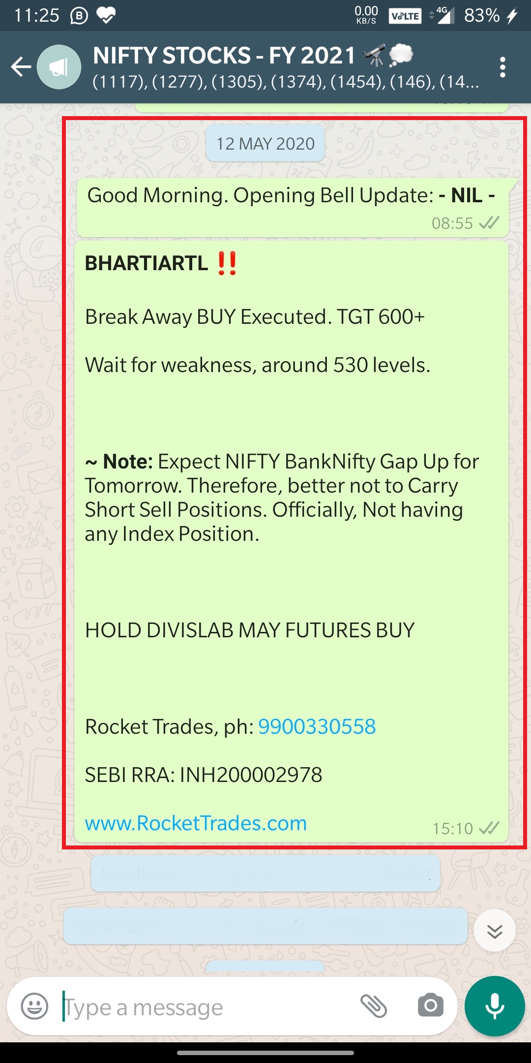 *BHARTIARTL – BUY advised @ 530 then all time high was 567.55, then made fresh ATH 612