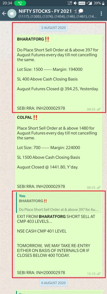 Short Sell advised at 397, Executed at & above 405 for 90% plus Clients and then made day low of 394.3 as Market Opening was that.