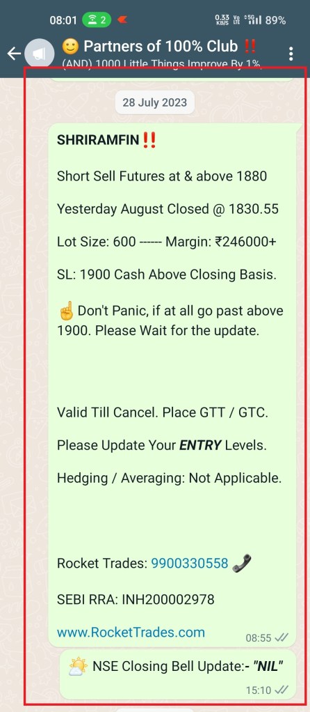 Similarly we advised a short sell trade in SHRIRAMFIN August futures at 1910