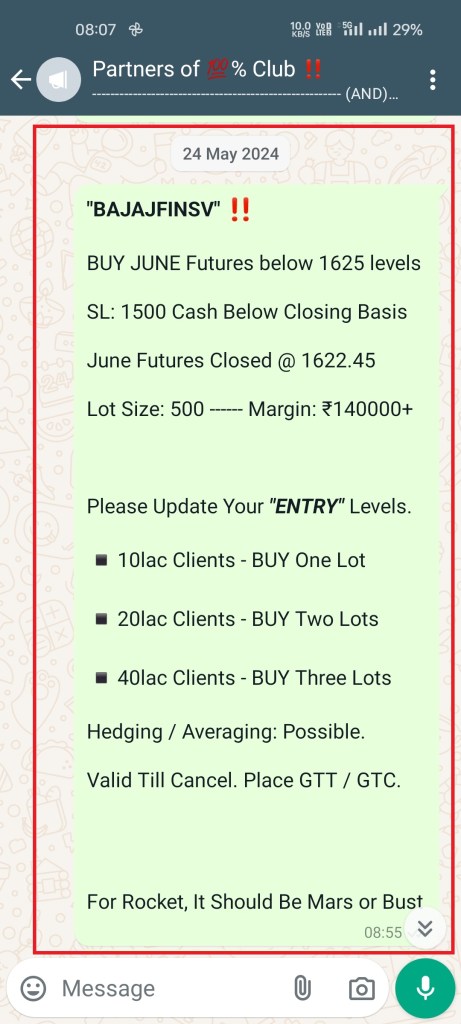 5). No doubt that BAJAJFINSV indeed closed below our given Stop-loss at 1500 on 4th June 2024 (General Election Results Day) but we didn’t book losses rather advised BUY in NIFTY June Futures at 22080 levels and continued to hold BAJAJFINSV with BANKNIFTY Futures as well.