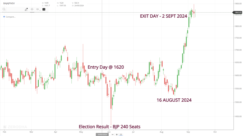 In this BAJAJFINSV case, from 1520 To 1860, that good 340pts price movement happened in only 12 working days, that is from 16 August 2024 to 2 September 2024. And, on all other working days it was just trading negatively.